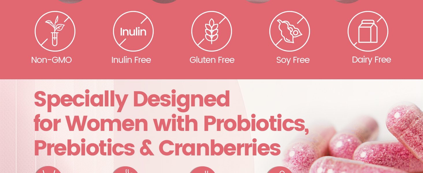 Protección femenina: Arándano para vías urinarias y Lactobacillus reuteri para salud vaginal.