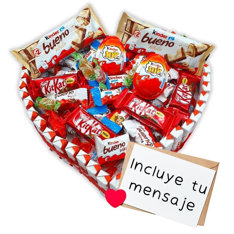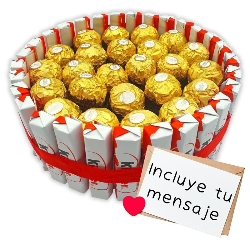 Cada elemento, esta cuidadosamente seleccionado para crear un caja perfecta para regalar, incluye: 29 Kinder Chocolate 23 Bombones Ferrero Rocher 1 Rosa de Gominola Sabor Fresa. 1 Tarjeta con tu mensaje personalizado